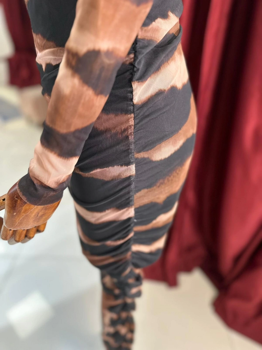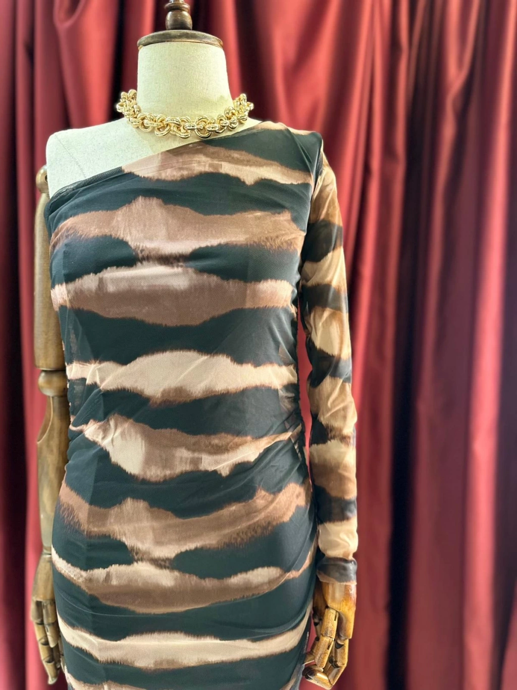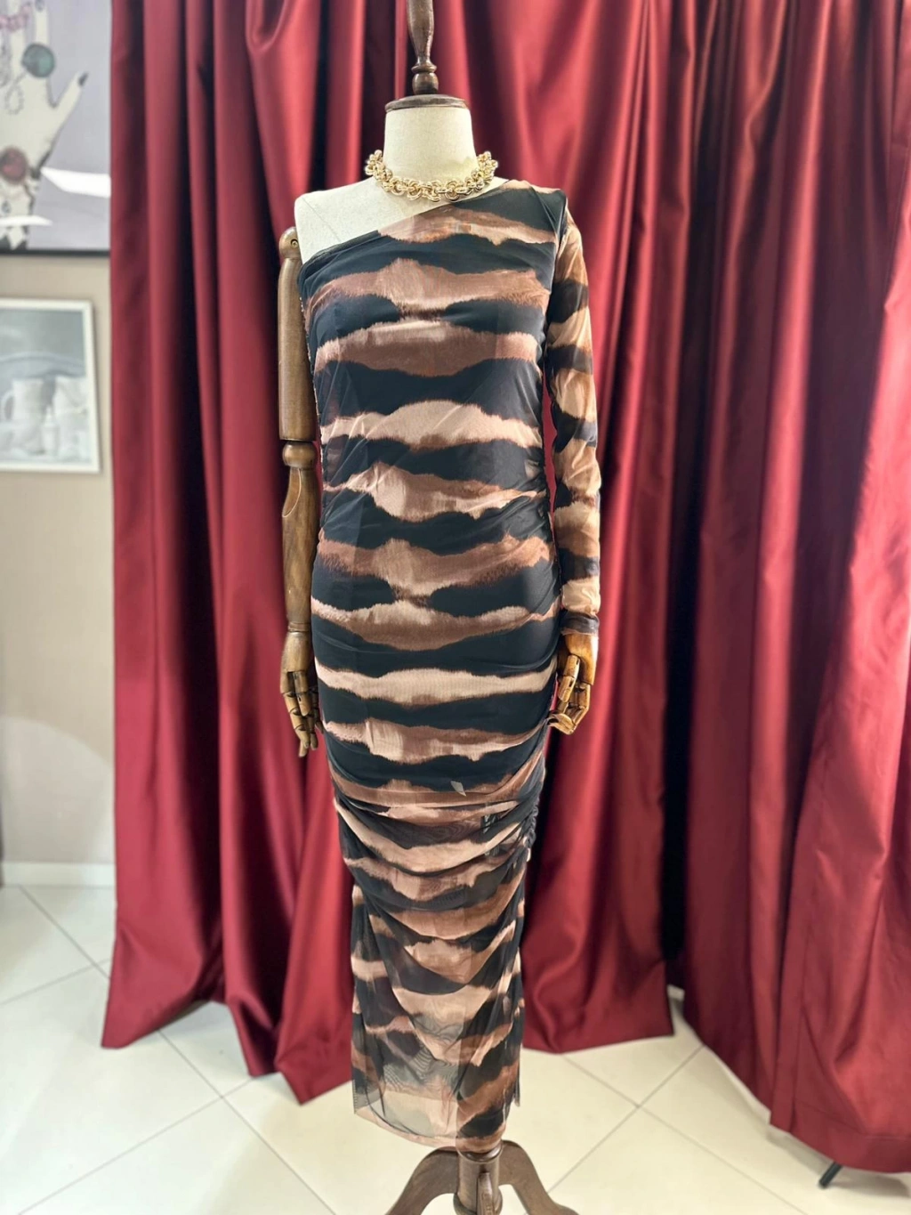 • YARIM ASTARLI KOL TRANSPARAN DETAY TÜL TEK KOLLU OMZU AÇIK YANLARIN BÜZGÜLÜ MİDİ BOY ELBİSE