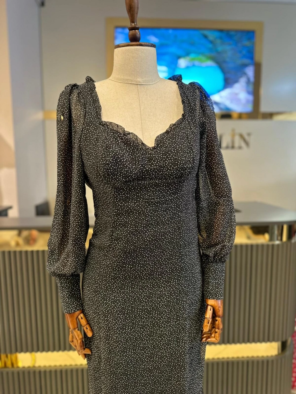 • YILDIZ DESENLİ GÖĞÜS DEKOLTELİ İÇ ASTARLI ARKADAN FERMUARLI ÇOK DAR KALIP GÖRSELDE SMALL BEDEN KULLANILMIŞTIR