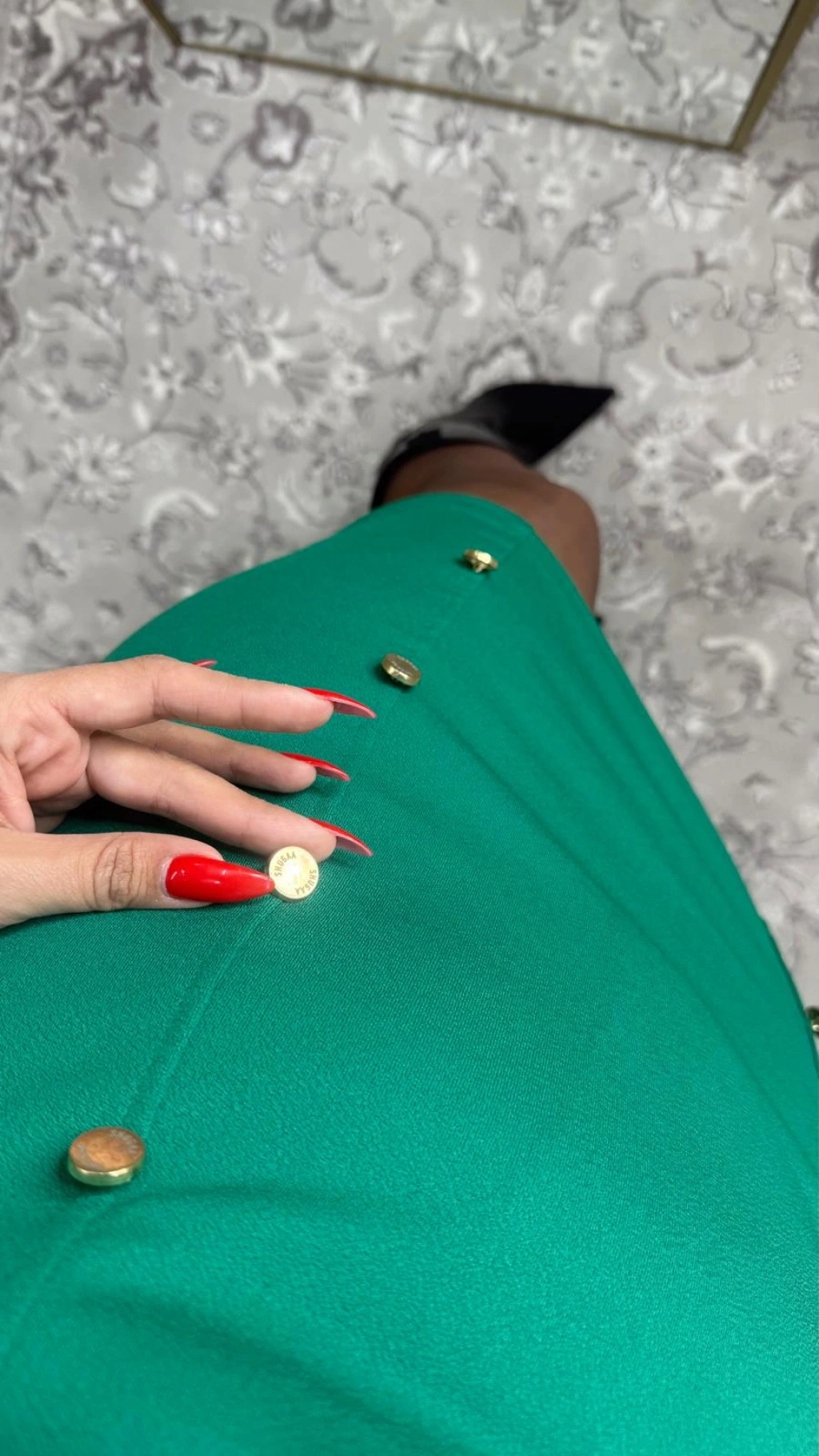 • Yeşil düğme detaylı arkadan fermuarlı esnek kumaş dokulu elbise