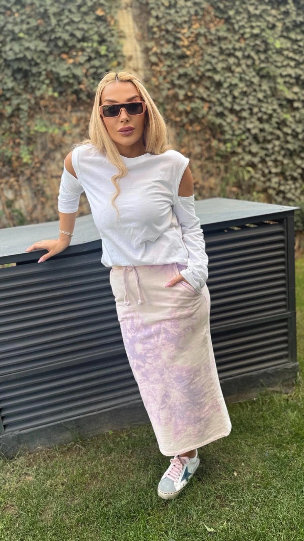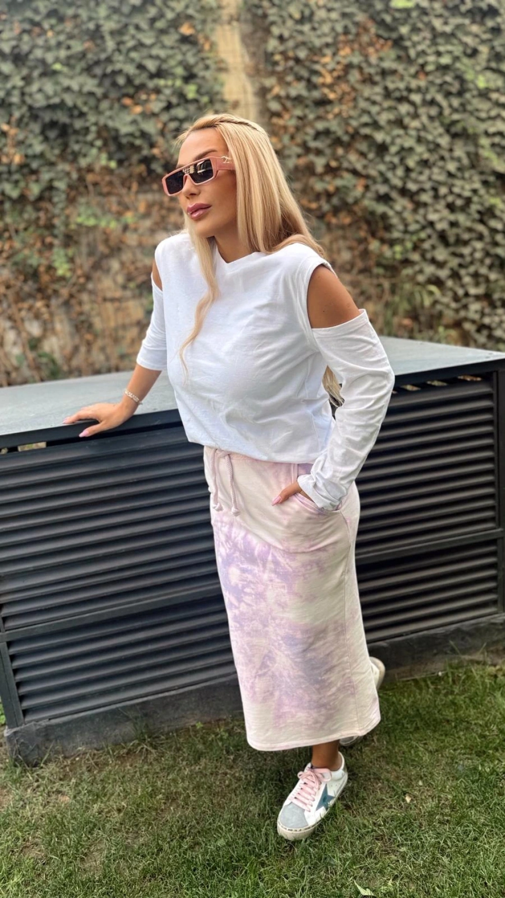 • BELİ LASTİKLİ İÇ GÖSTERMEZ BATİK DESEN ARKADAN HAFİF YIRTMAÇLI CEPLİ ETEK