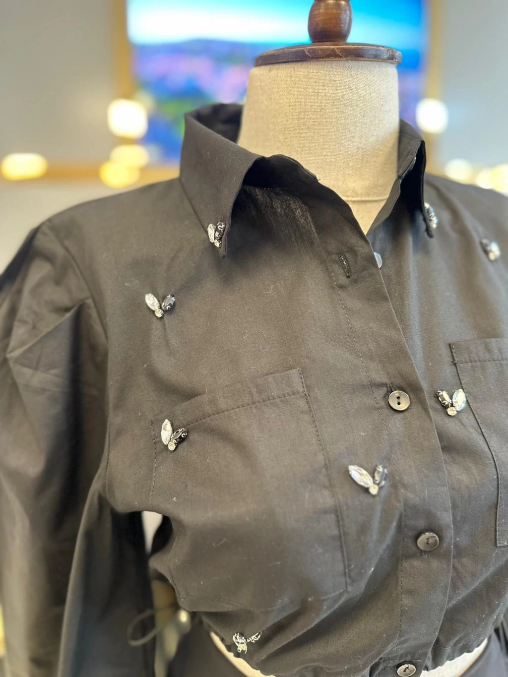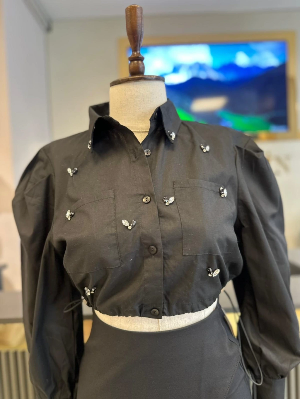 • BELİ LASTİKLİ TAŞLI CROP GÖMLEK