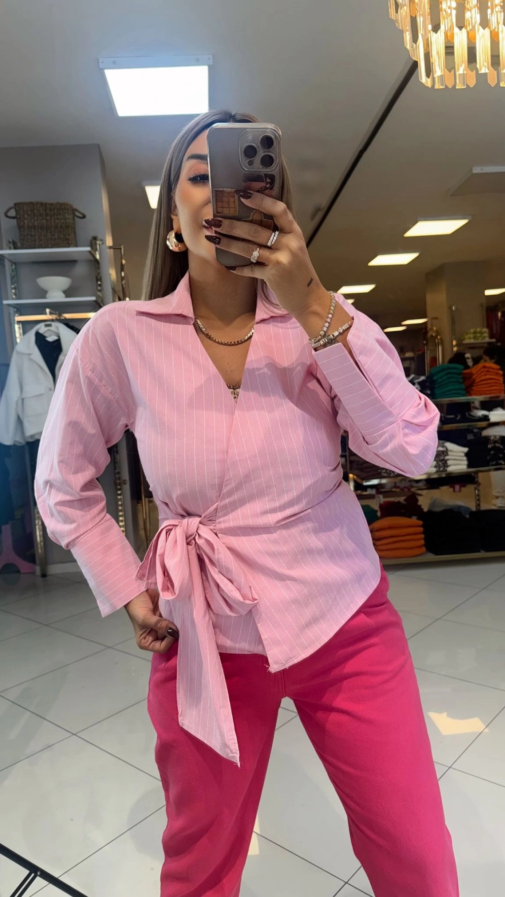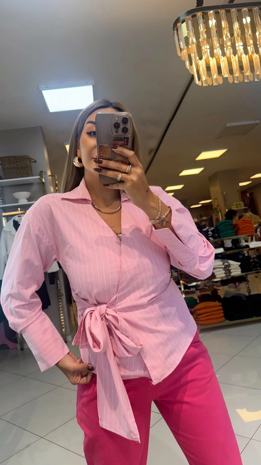• YANDAN BAĞLAMALI PEMBE ÇİZGİLİ GÖMLEK DAR KALIP