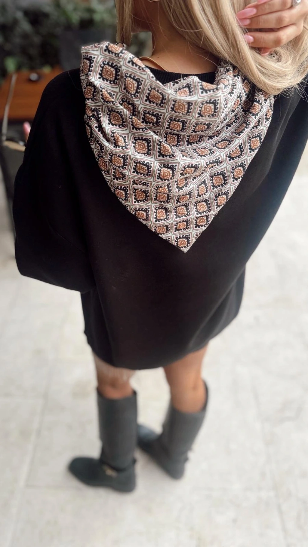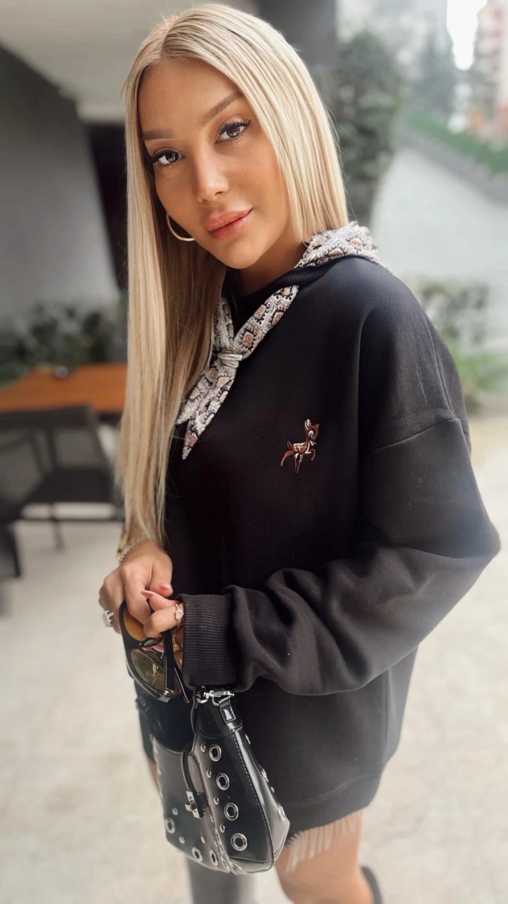 • FULAR DETAYLI İŞLEMELİ 2 İPLİK ŞARDONLU SWEATSHİRT RAHAT KALIPTIR