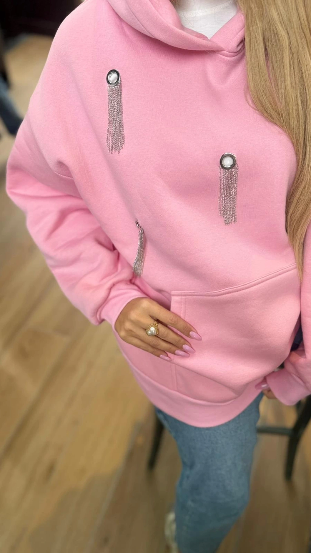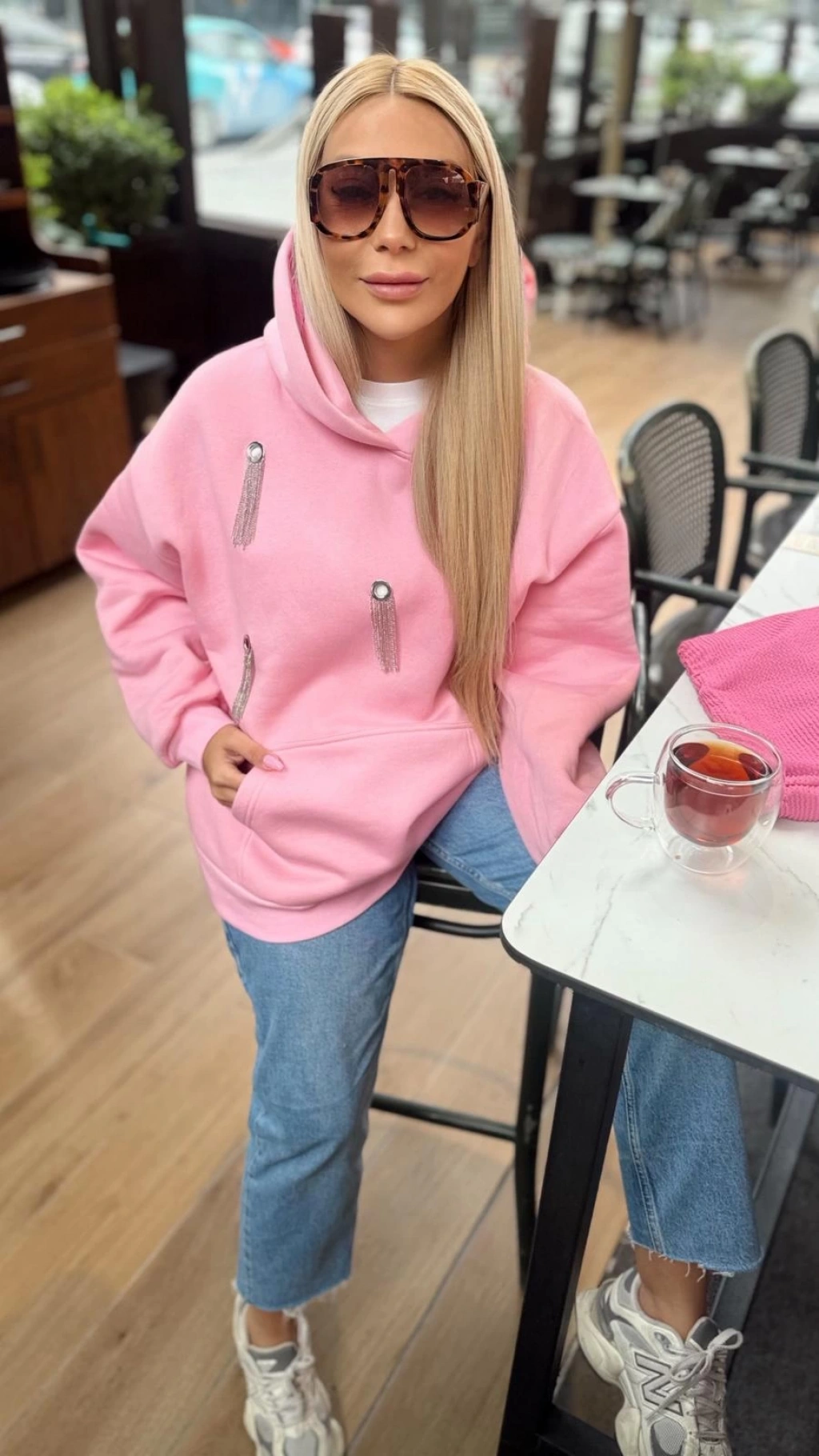 • PEMBE ZİNCİR DETAYLI KAPŞONLU ŞARDONLU CEPLİ SWEAT