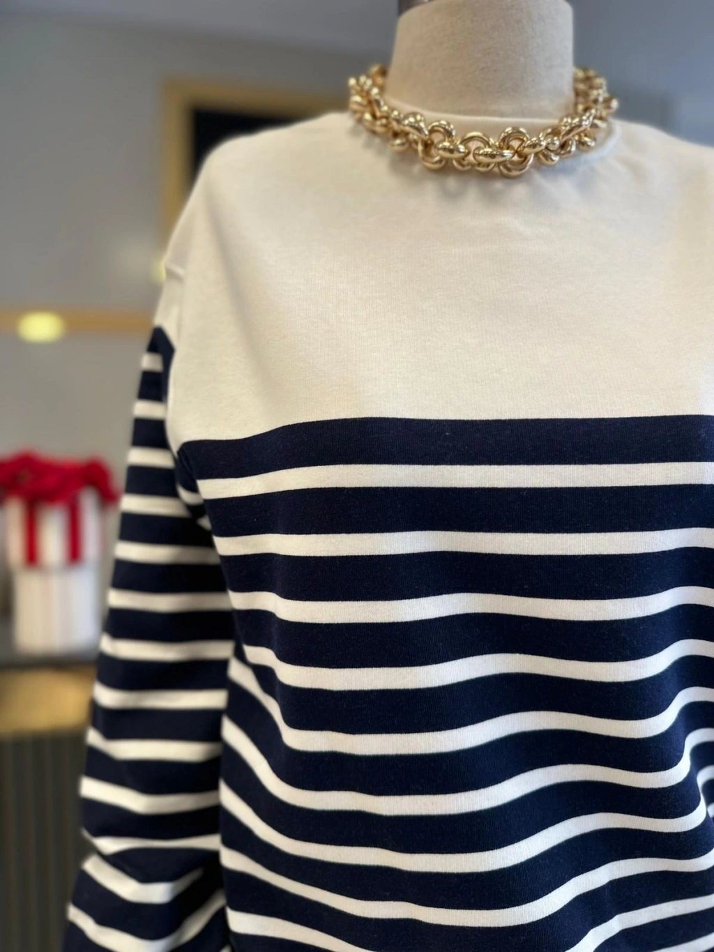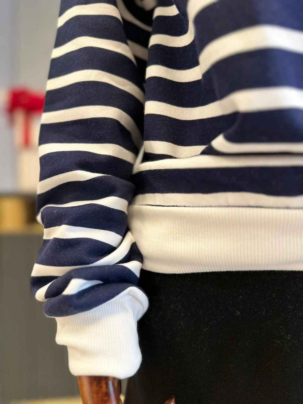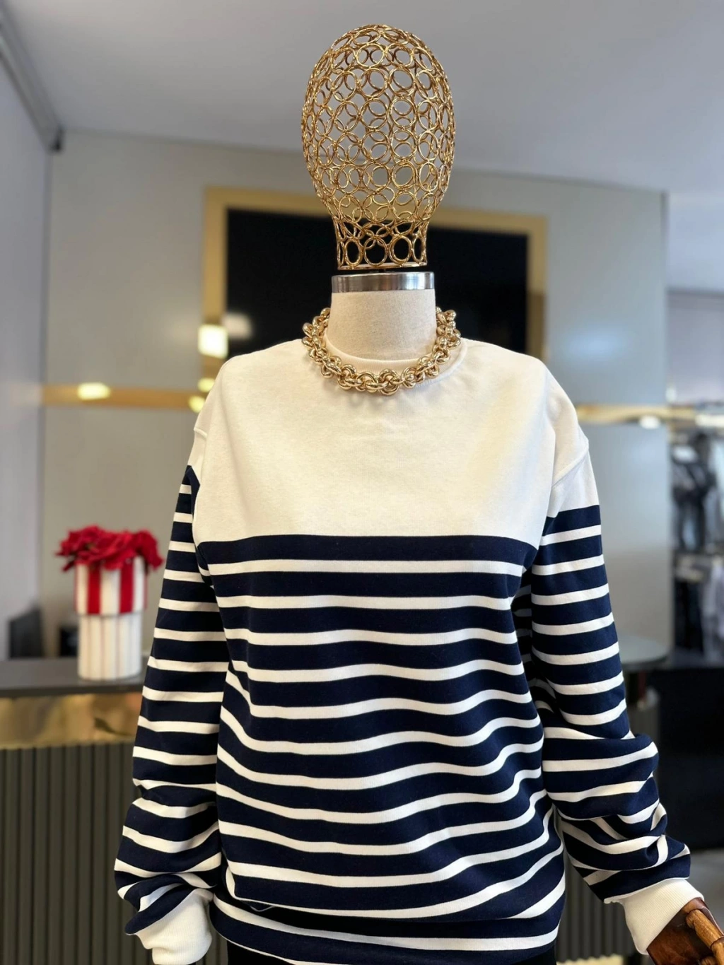 • BEYAZ ÜZERİ LACİVERT ÇİZGİLİ BELİ VE KOLU LASTİKLİ SWEATSHIRT YIKAMADA RENK VEREBİLİR GARANTİ VEREMİYORUZ