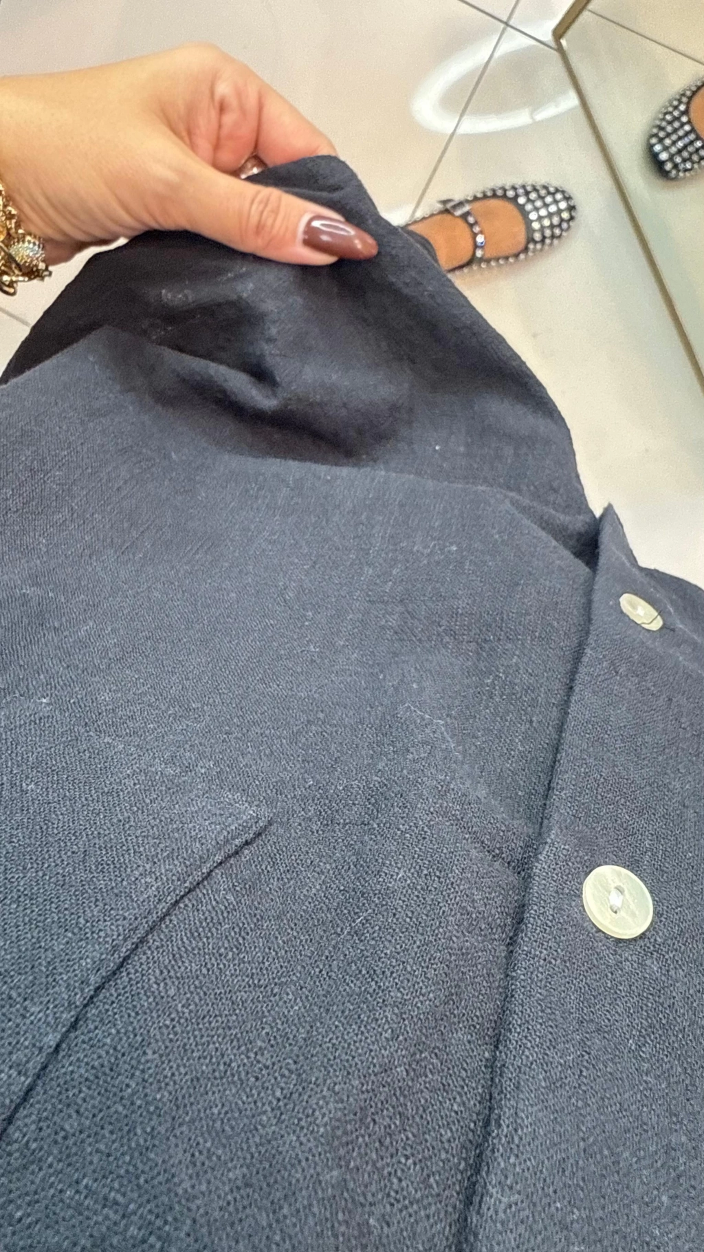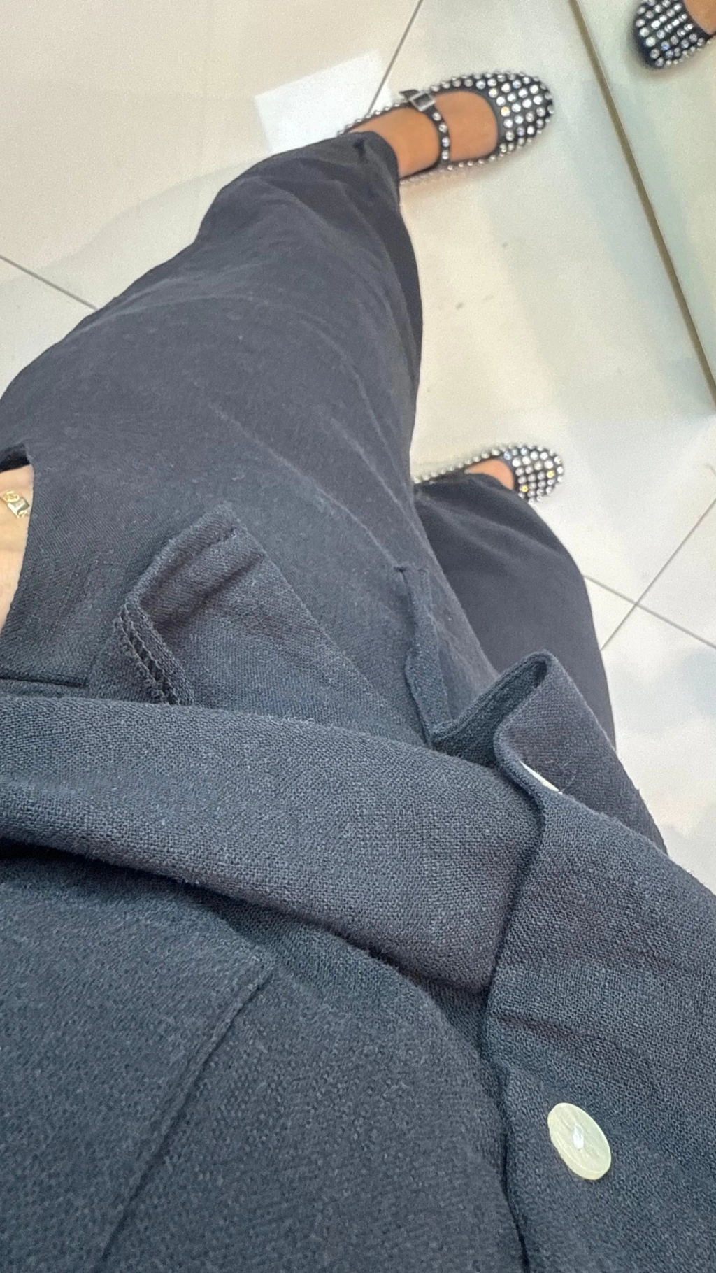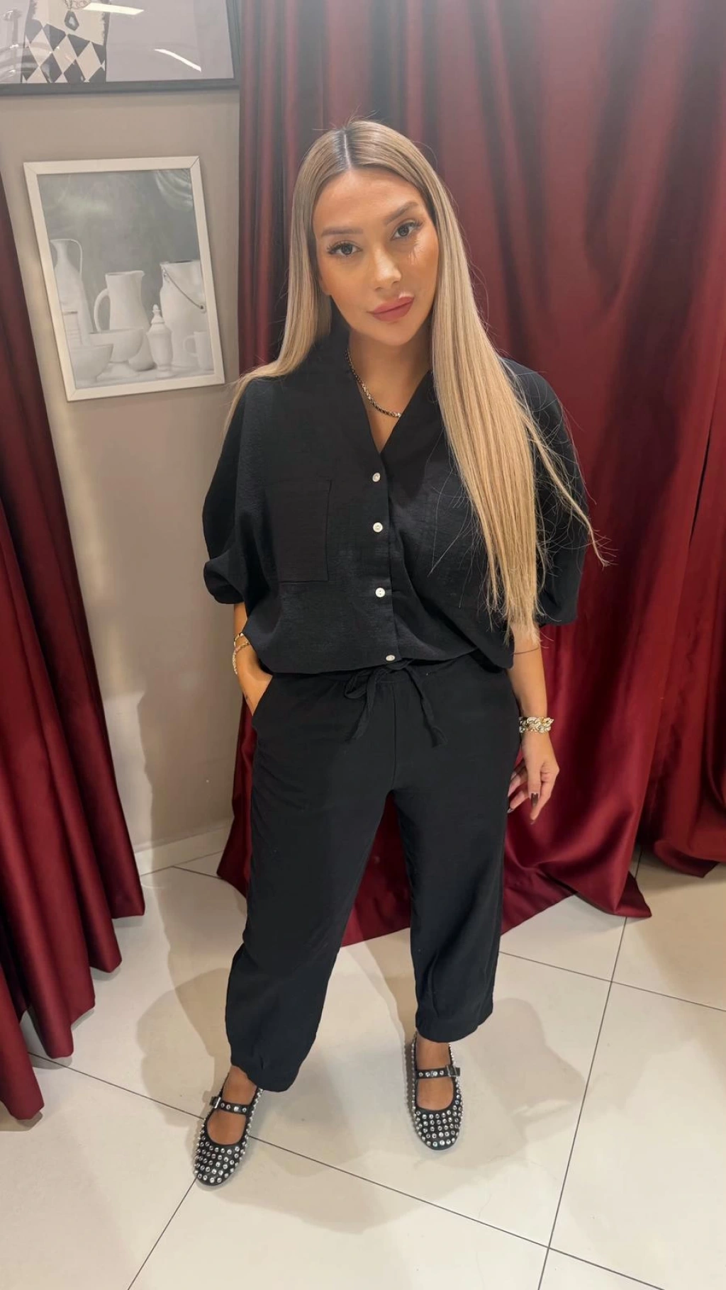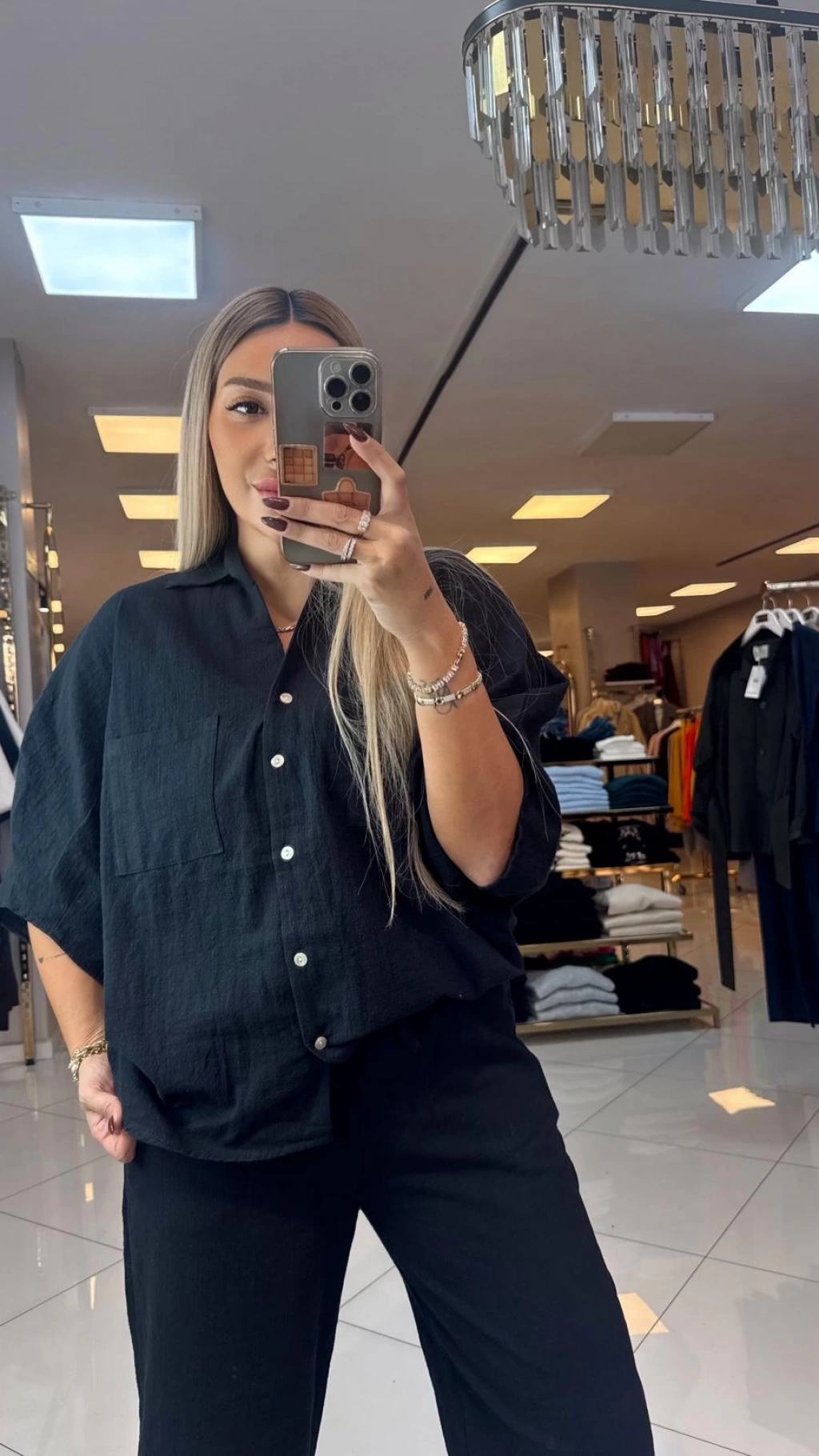 • STANDART BEDEN SİYAH TAKIM KETEN ELBİSE KALIN KUMAŞ DOKUSU RAHAT KALIP BELİ LASTİKLİ CEPLİ İÇ GÖSTERMEZ GÖMLEK PANTOLON TAKIM
