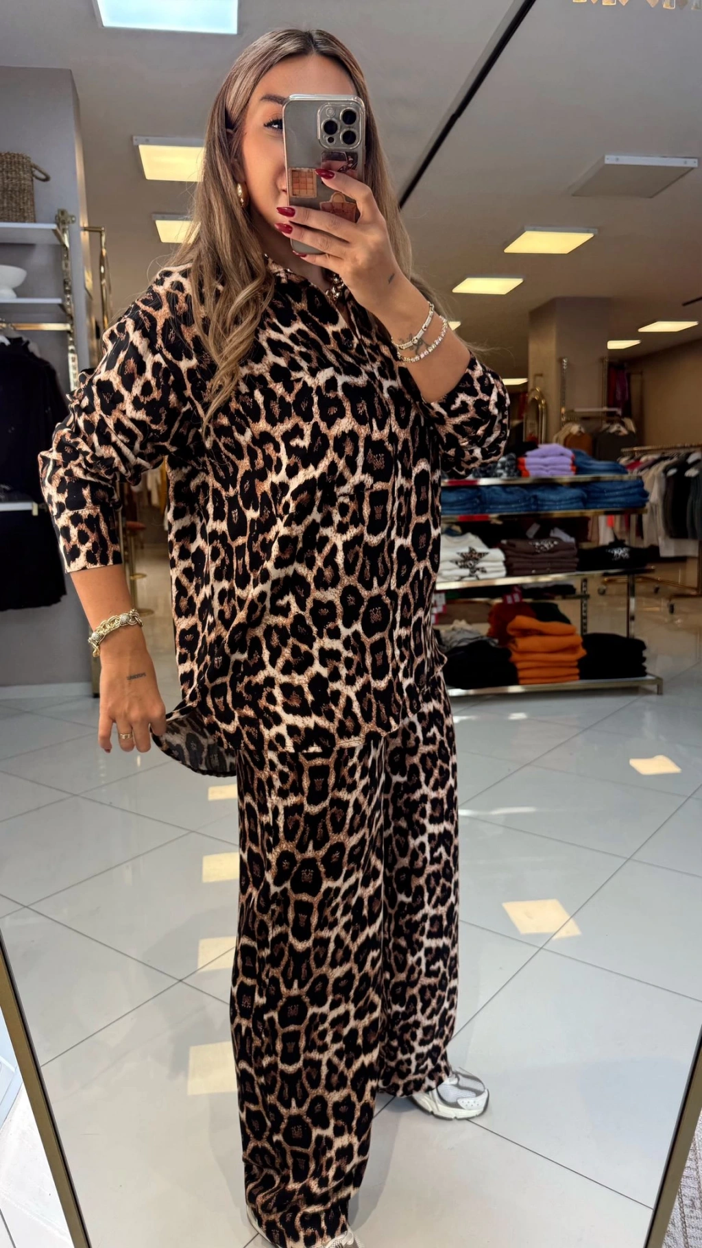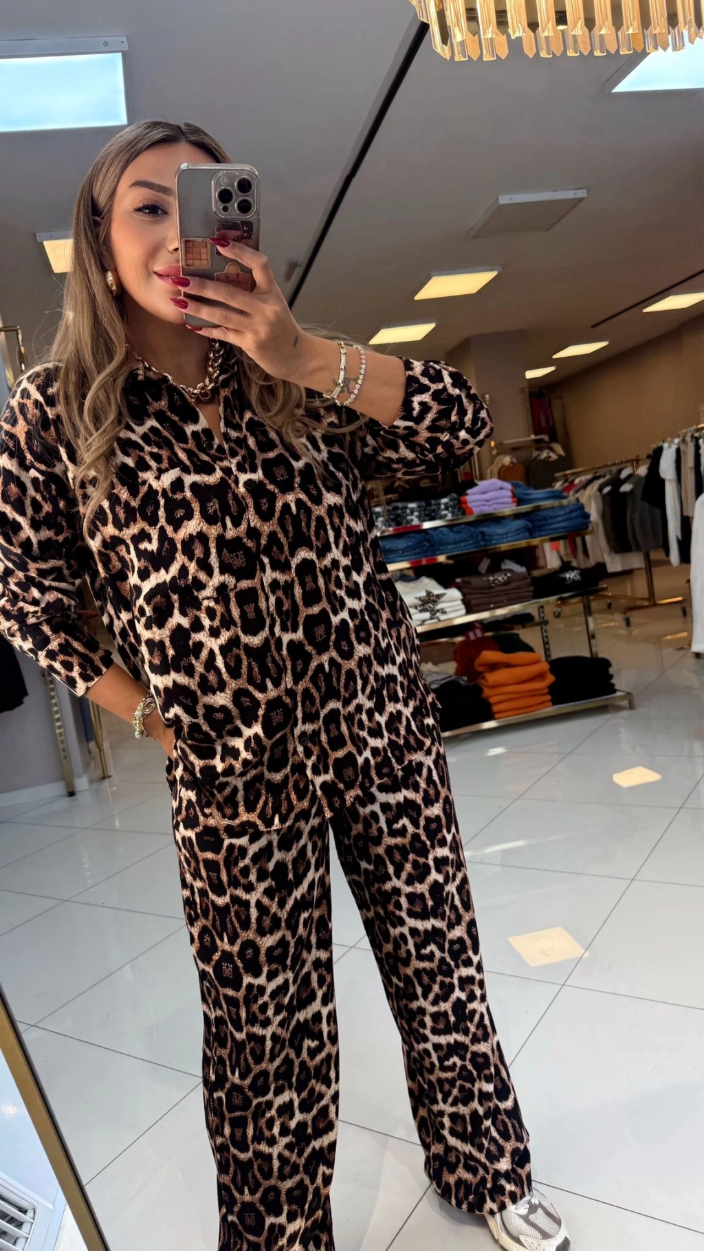 • LEOPAR TAKIMI S BEDEN GİYİLDİ ÇOK GENİŞ KALIP GÖMLEK KALÇAYI KAPATIYOR PANTOLON BELİ LASTİKLİ YÜKSEL BEL CEPLİ İÇ GÖSTERMEZ